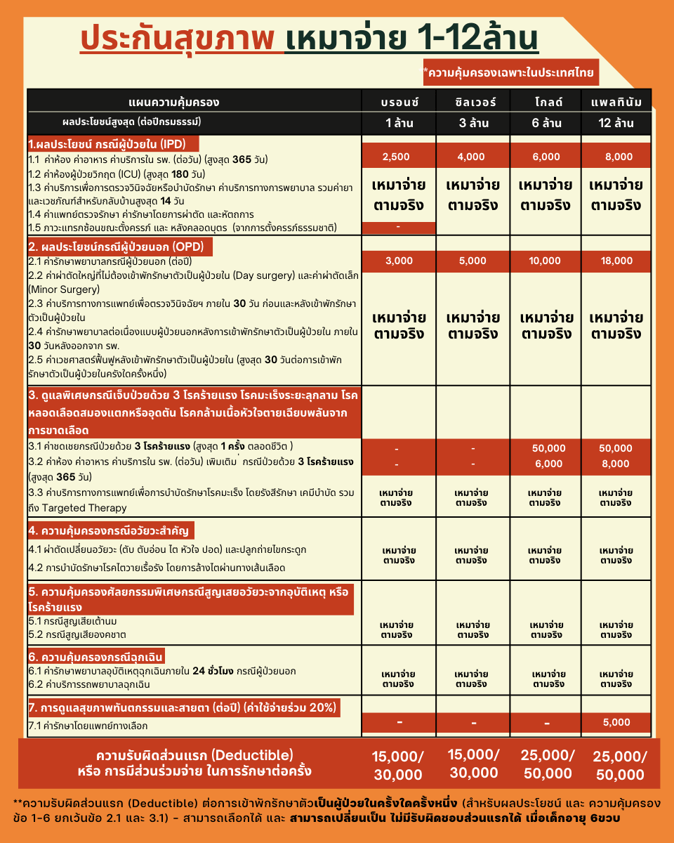 ส่วน ประกันสุขภาพสำหรับเด็ก เบี้ยค่อนข้างสูง ผู้ปกครองที่ห่วงใยบุตรด้านสุขภาพ จะมีทางเลือก ในส่วนของ ความรับผิดชอบส่วนแรก 10,000 / 15,000 / 30,000 ต่อการป่วยที่เข้ารักษาตัวในโรงพยาบาล 1ครั้ง (ดูความหมายของ ความรับผิดชอบส่วนแรกได้ที่นี่) หามีงบประมาณ โดยเมื่อบุตรอายุ 6ขวบขึ้นไป จะสามารถเลือกเป็นไม่มีความรับผิดชอบส่วนแรกได้ ทั้งนี้ทั้งหมด ขึ้นอยู่กับงบประมาณ รายได้ของผู้ปกครอง