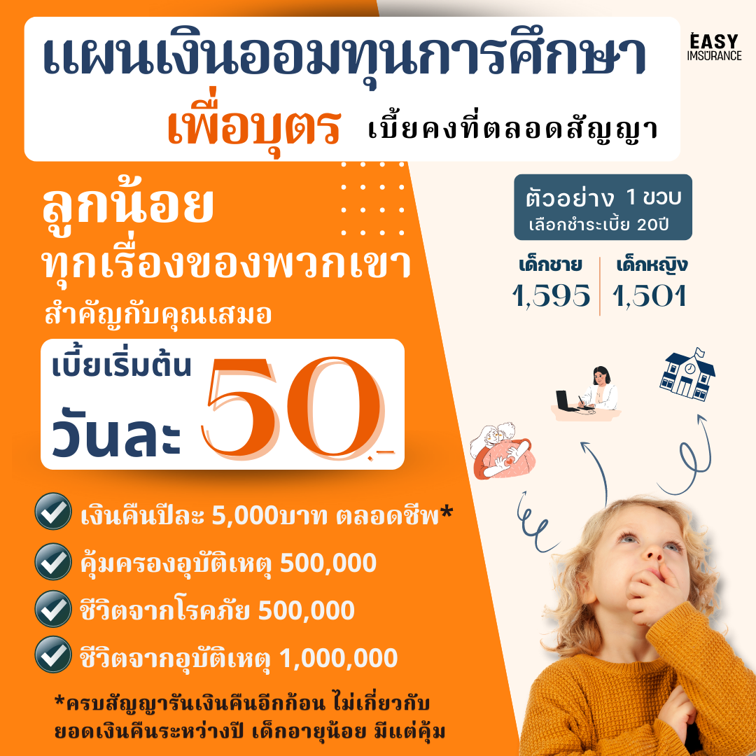 เรามีแผนแนะนำ สำหรับลูกสุดที่รักของทุกคน ทุกแผนจะมีเงินคืนตลอดสัญญา และ เมื่อครบสัญญา หรือ เสียชีวิต ยังได้รับเงินก้อน ตามทุนประกันที่ทำไว้