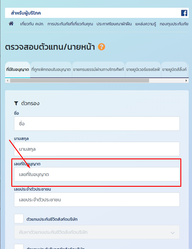 A : ลูกค้าสามารถนำเลขที่ใบอนุญาตไปกรอก (ไม่ต้องใส่ข้อมูลอื่นๆ ใส่แค่ตามรูป) ในระบบของ คปภ เพื่อตรวจสอบสถานะได้ทันที กดที่นี่
