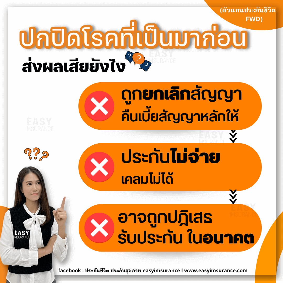 สำหรับโรคประจำตัว จำเป็นมากที่ต้องแจ้งกับตัวแทน และ ตอนกรอกสมัคร ซึ่งหากลูกค้า มีโณคประจำตัวต้องห้าม หรือ โรคประจำตัวที่บริษัทประกันไม่รับทำ ก็จะไม่สามารถสมัครทำประกันได้เลย โรคที่ประกันไม่รับทำ อ่านจากด้านล่าง