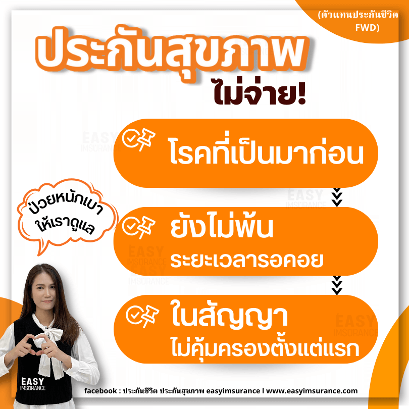 ข้อแรก เป็นพื้นฐานเงื่อนไข ของประกันสุขภาพ ของทุกบริษัทอยู่แล้ว หากมีโรคที่เป็นมาก่อนทำประกันก็จะเบิกไม่ได้ ซึ่งจะสลักหลังอยู่ในกรมธรรม์ตั้งแต่แรก ดังนั้น ประกันต้องทำก่อนป่วย เพื่อปกป้องตนเอง เพราะบางโรคมีเงินเก็บมากแค่ไหนก็ไม่พอ