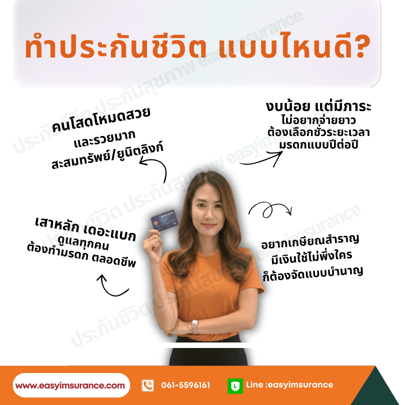 อย่างแรก แบบตลอดชีพ เหมาะกับเป็นมรดก คนที่มีภาระบ้าน รถ หรือเป็นเสาหลักหาเงินคนเดียว เพราะถ้าล้มไปคงพังทั้งบ้าน เน้นเบี้ยที่พอดีจ่ายระยะสั้นหรือยาวก็ได้ แต่คุ้มครองยาวไปถึงอายุ 90หรือ99 ปี และเบี้ยมีมูลค่า ฉุกเฉินเมื่อหยุดจ่าย ก็ยังใช้มูลค่าต่างๆในกรมธรรม์ของเราได้ด้วย ที่สำคัญ! เป็นแบบที่เหมาะกับการ ซื้อประกันสุขภาพ หรือ ประกันโรคร้ายแรง มากที่สุดด้วย