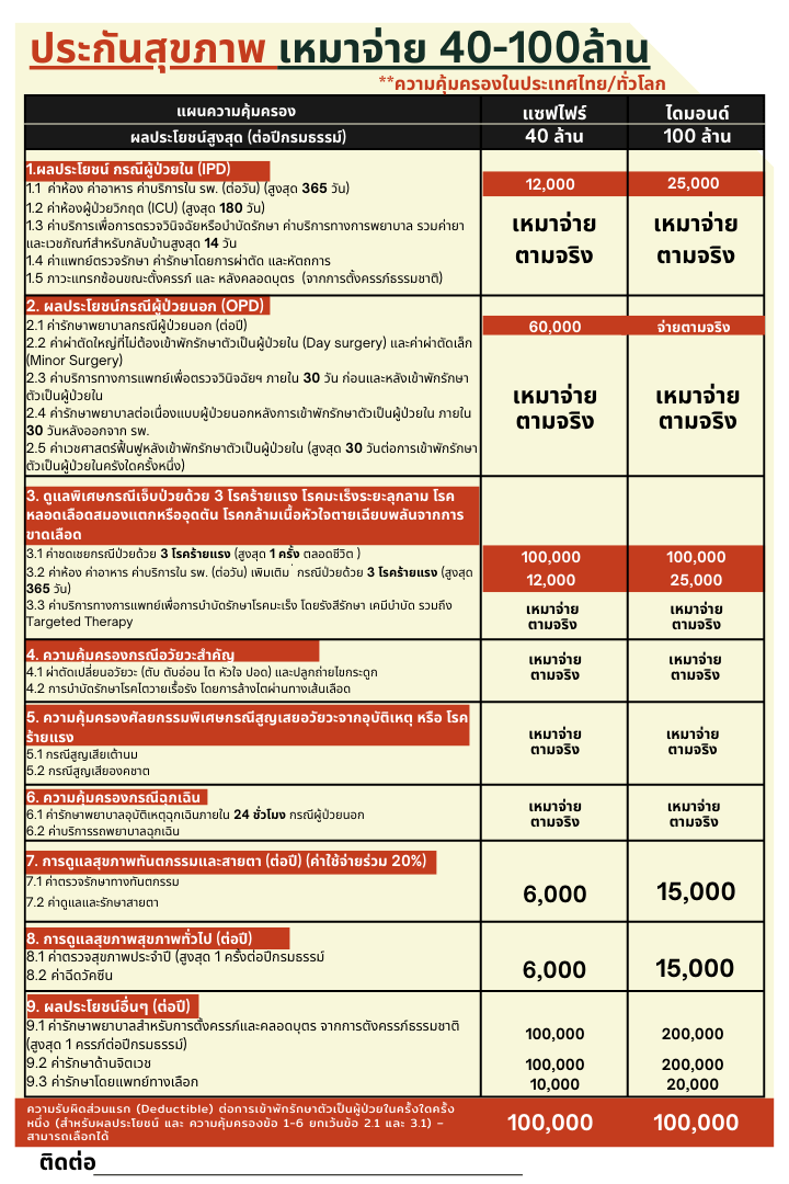 รายละเอียดที่แสดงเป็นเพียงแค่สัญญาเพิ่มเติม ลูกค้าต้องซื้อเพิ่มเข้าไปจากประกันชีวิต หรือดู แผนประกันสุขภาพทั้งหมด กดที่นี่